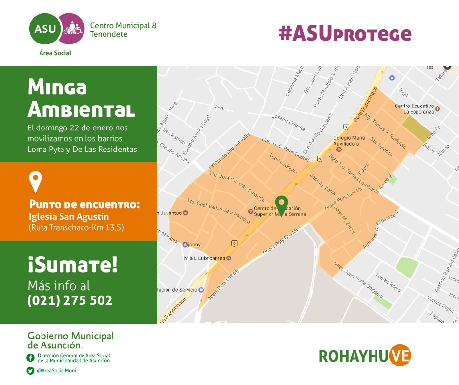 La Municipalidad de Asunción, a través del trabajo en conjunto entre las Direcciones Generales del Área Social, Servicios Urbanos, Gestión Ambiental y Reducción de Riesgos y Desastres comenzará este domingo 22 la campaña de mingas ambientales «AsuProtege» con la finalidad de prevenir y disminuir casos de dengue y otras enfermedades transmitidas por el vector Aedes aegypti.