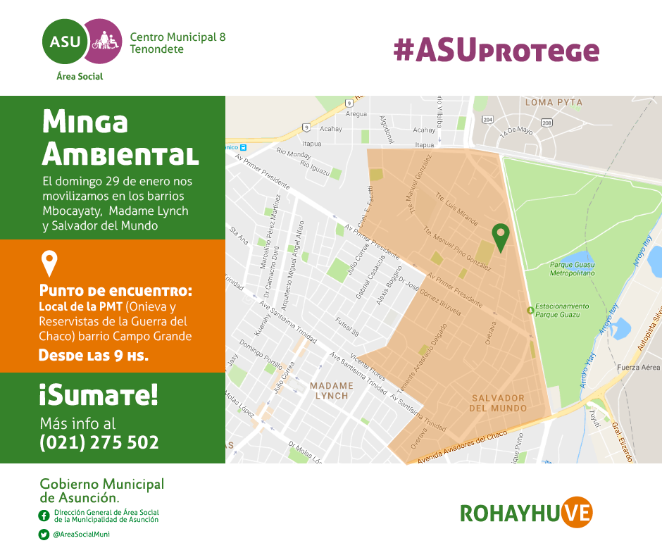 En el marco de la campaña “AsuProtege”, este domingo 29 de enero se realizará la segunda minga ambiental organizada por la Municipalidad de Asunción, específicamente en el barrio Mbokajaty, en las cercanías de las instalaciones de la Policía Municipal de Tránsito-PMT-.