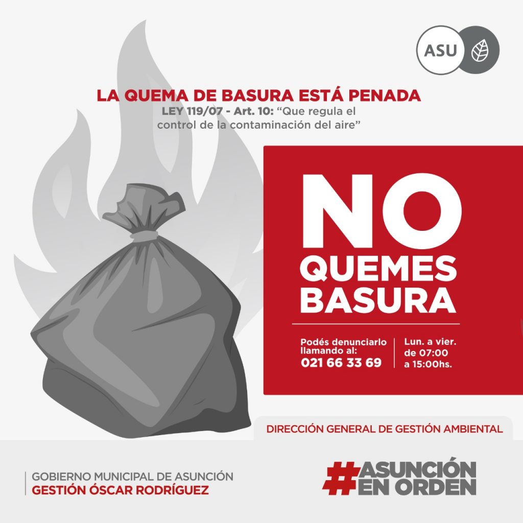 • La Ord. 119/07 “Que regula la calidad del Aire” en la ciudad de Asunción menciona en el Art.10 que “Está estrictamente prohibida la combustión o quema en las calles o domicilio, de cualquier material que produzca emisiones al ambiente y que pueda afectar a los vecinos. Comprende la quema de combustibles o de desechos de cualquier tipo (basura, residuos, papeles, residuos vegetales, de fibras naturales, plásticos en general, etc.).