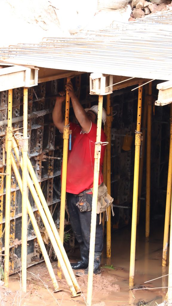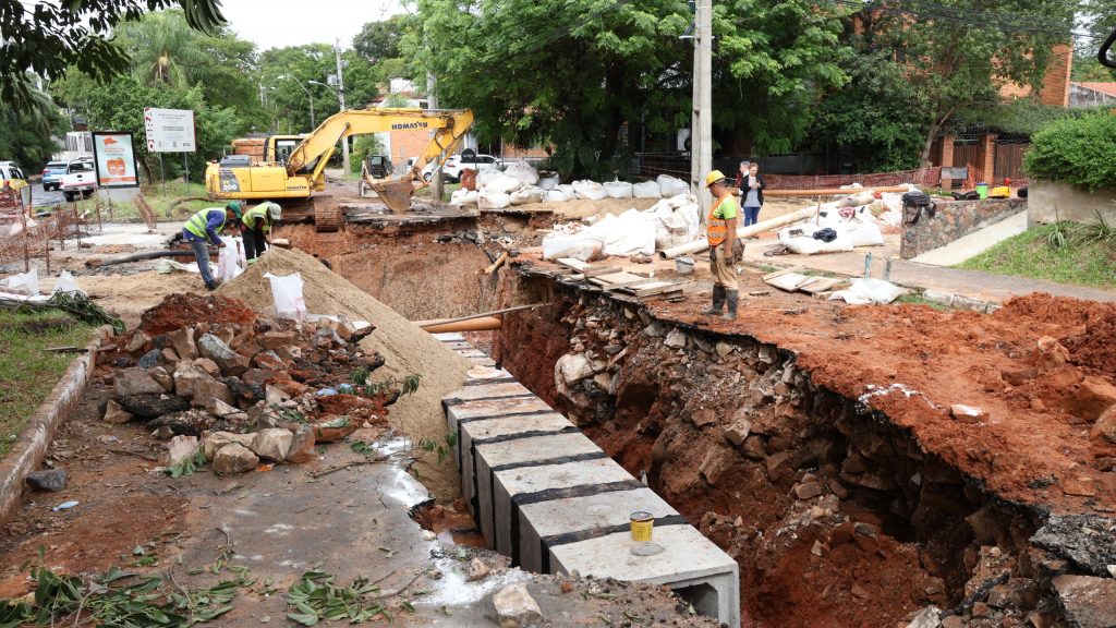 Asimismo, señaló que, en la intersección de Nuestra Señora del Carmen y Augusto Roa Bastos, se ejecutan actualmente trabajos de excavación para la construcción de un registro de grandes dimensiones —6,20 metros por 6,20 metros y una profundidad de 4,80 metros—, lo que requiere un proceso constructivo complejo que incluye excavación profunda, encofrado, armado de estructuras y posterior hormigonado.