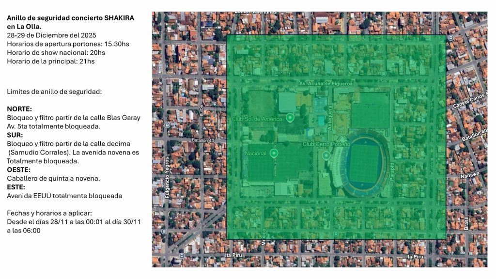 Aclaró que el operativo se basa en un esquema geográfico suministrado por la organización de los conciertos, que establece un perímetro de circulación restringida. Las calles afectadas son: Quinta Avenida, Caballero, Novena Proyectada y Estados Unidos, donde no podrá ingresar ningún vendedor ambulante ni persona ajena a la actividad.