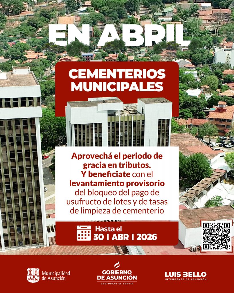 El levantamiento provisorio de la caducidad, para el pago de impuestos, tasas y cánones atrasados por lotes de cementerios, en el marco del período de gracia establecido por el intendente capitalino, Luis Bello, rige hasta el 30 de abril del corriente año.