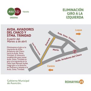 Con en fin de mejorar la velocidad de desplazamiento de los vehículos que ingresan por Asunción utilizando el superviaducto, la Dirección de Tránsito de la Municipalidad de Asunción elimina desde hoy el giro a la izquierda desde la Avda. Aviadores del Chaco hacia la Avda. Santísima Trinidad. De esta manera, los semáforos que se encuentran en la intersección pasan a funcionar a dos tiempos mejorando el tiempo de espera en dicho cruce.